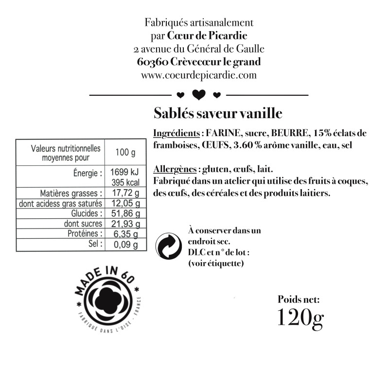 Nos petits biscuits sablés à la vanille avec 15% d'éclats de framboise sont réalisés avec soin dans notre atelier à Crèvecoeur-le-Grand.